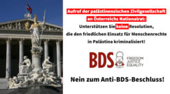 At the rally and afterwards, some activists of “MIGRANTIFA WIEN” tried to apologize to us. But we fear that they did not apologize out of an understanding that their actions came from a place of deeply internalized and reproduced racism, that they did not because they realized that organizers of the rally, within the own group, “abuse protests to also send out other messages” (Alexia Weiss) – namely ostracising the Palestinian struggle from other antiracist causes here and elsewhere – no, their fear was we as BDS Austria could release video recordings and pictures of the perpetrators to the public.